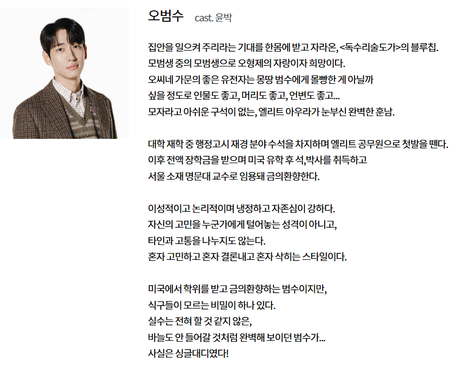- 서울의 명문대 교수이지만, 가족도 모르게 싱글 대디로 살아가고 있음.